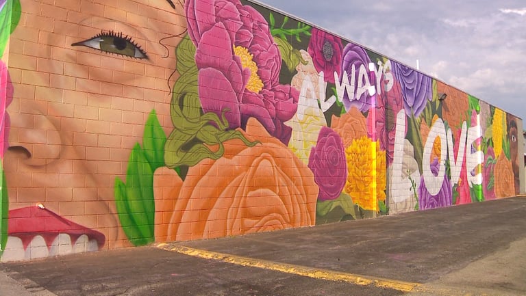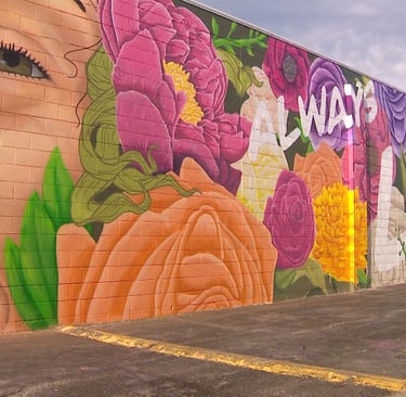 In 2022, I had the opportunity to participate in painting a 100-ft mural, alongside other high school students at the time. With local mural artist, Irineo Medina, together we crafted a beautiful mural and a sense of community over those few weeks in the summer of 2022. I take credit for finishing off the pink flower with the yellow center and twisting it to my art-style.