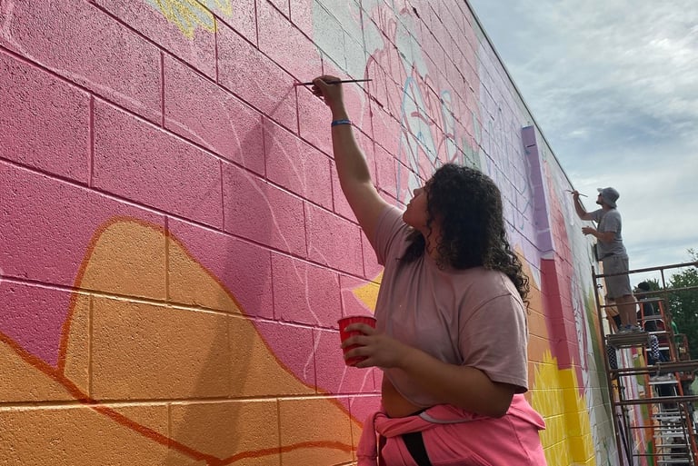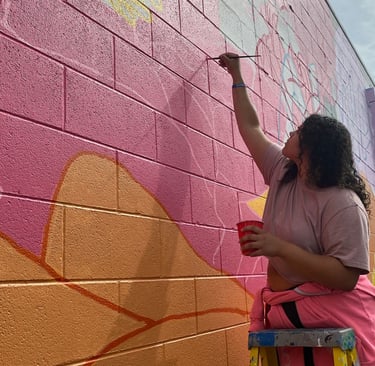 In 2022, I had the opportunity to participate in painting a 100-ft mural, alongside other high school students at the time. With local mural artist, Irineo Medina, together we crafted a beautiful mural and a sense of community over those few weeks in the summer of 2022. I take credit for finishing off the pink flower with the yellow center and twisting it to my art-style.